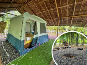 Guests who book glamping packages can enjoy their own private bonfire right in front of their accommodations, complete with a secluded area for comfort and privacy.