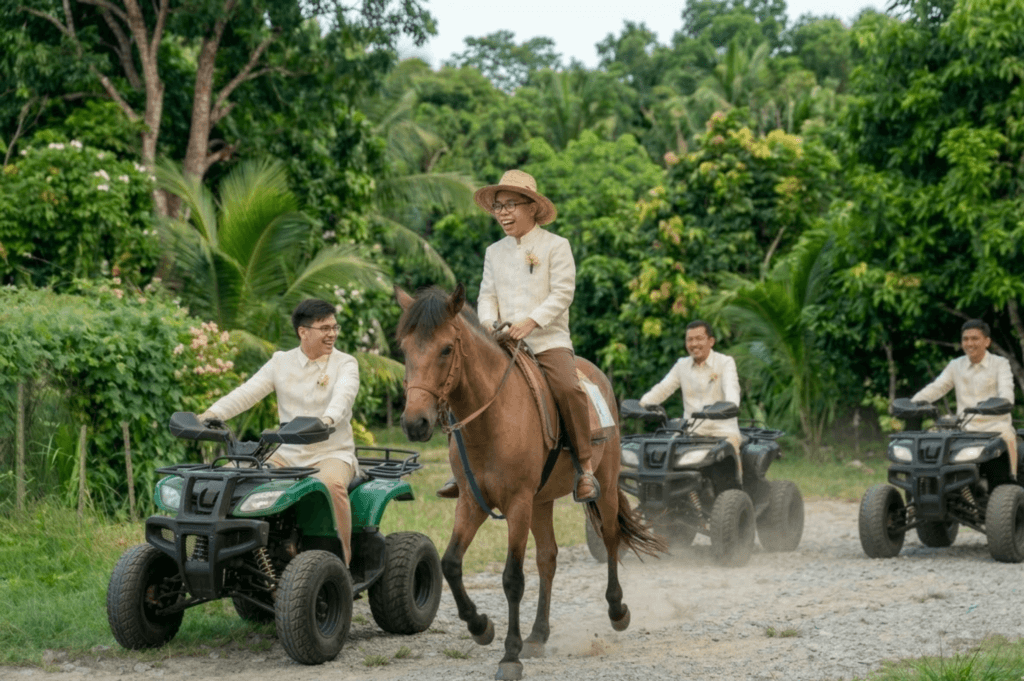 Create a grand entrance that amazes everyone! Make a heroic entrance on horseback, commanding attention, while the groomsmen make a dynamic, fun entrance on ATVs.